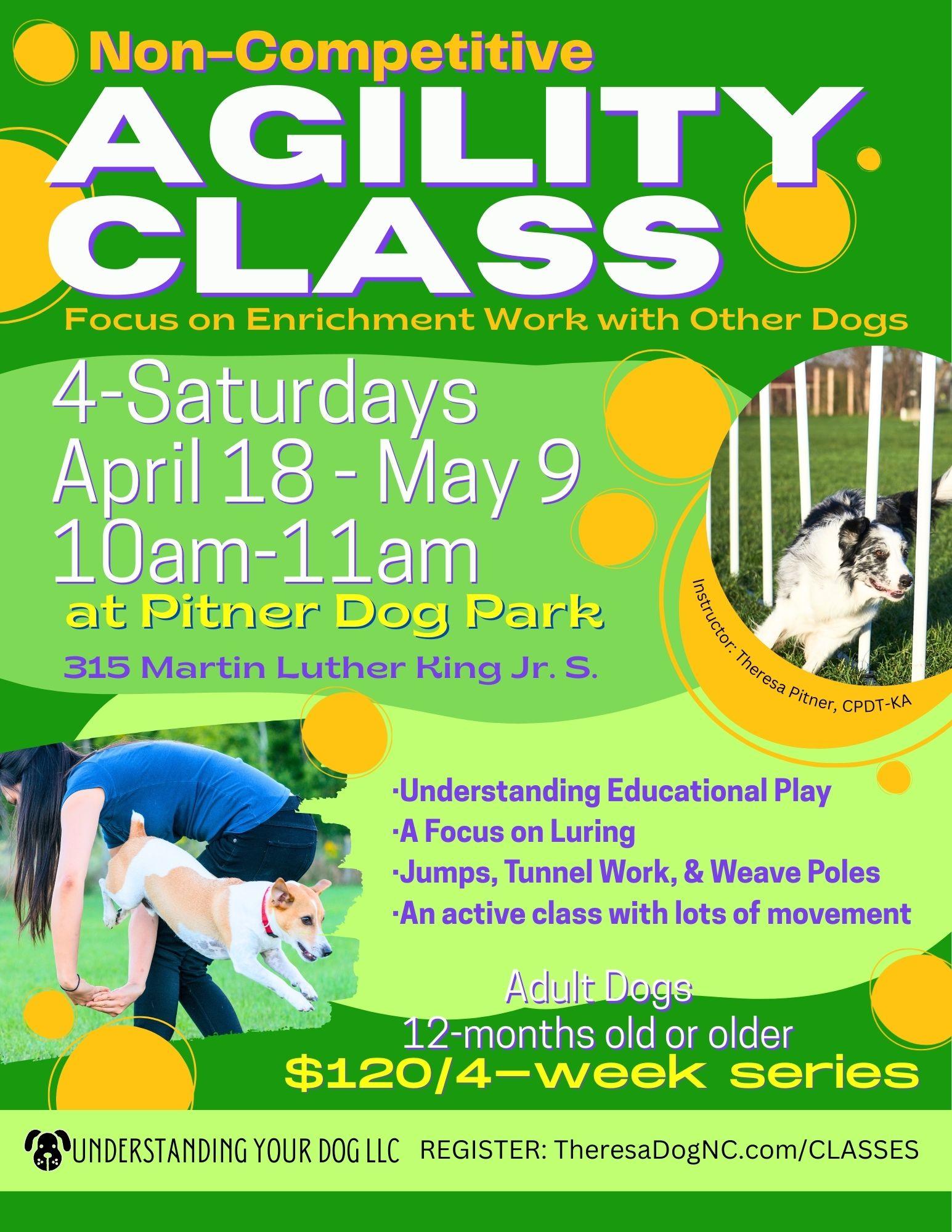 Learn: • Understanding Educational Play • A Focus on Luring • Jumps, Tunnel Work, & Weave Poles Classes will be held OUTDOORS at Pitner Dog Park (315 Martin Luther King…